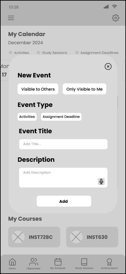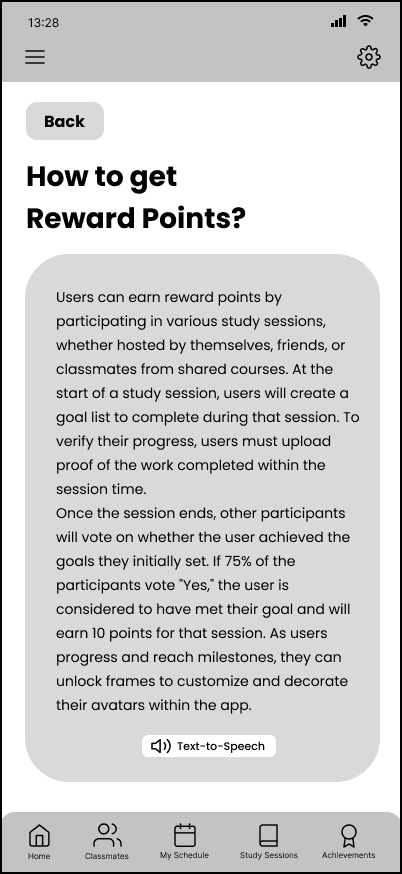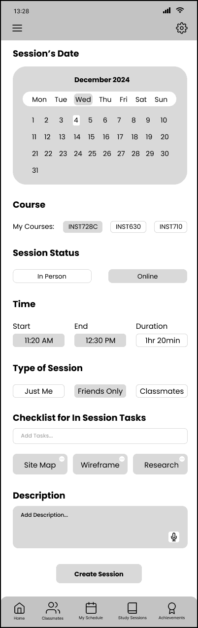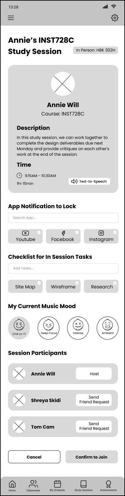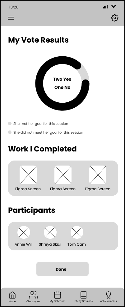 By seamlessly tying together the study sessions to specific courses, students can be more comfortable joining sessions as they know it will be with their peers. Students can find, join, or create study sessions in one app, minimizing distractions. Students can add items to their checklist for the session. The app will lock their phone while they are in an active study session, minimizing distractions but allowing the user to override it for emergencies, or ending the study session early. Users will be able to reflect on the productivity of the session by showing each other their completed work at the end, and affirming if the others were able to complete the tasks in their checklist.