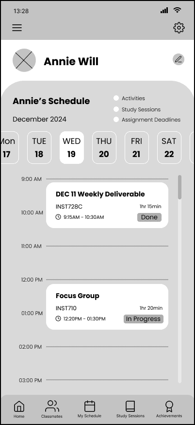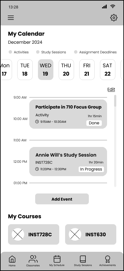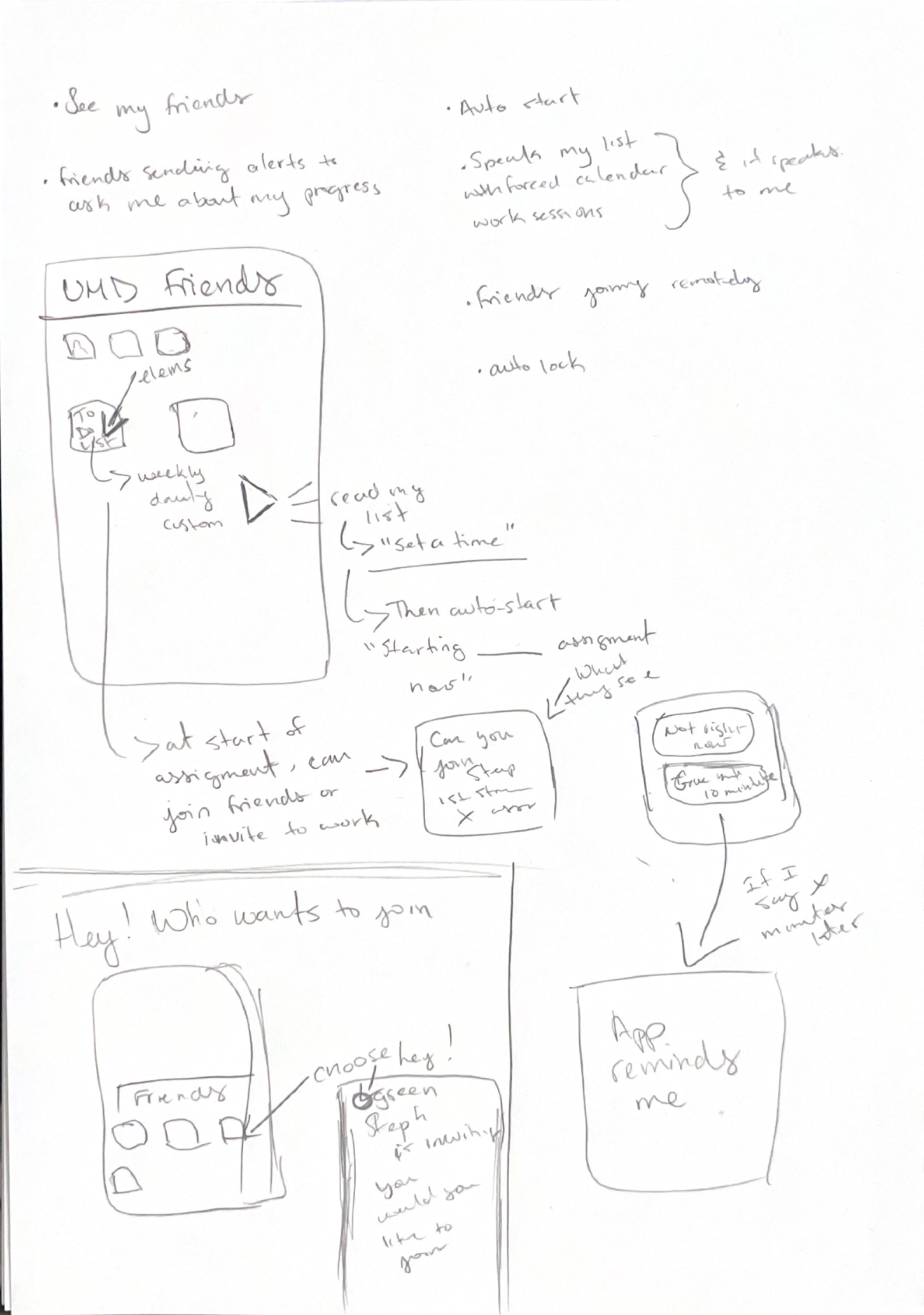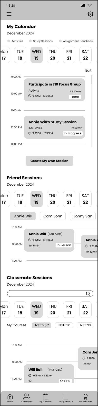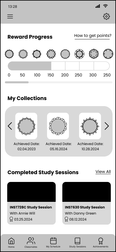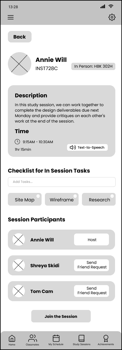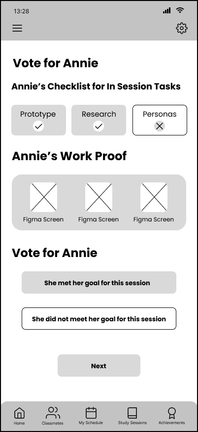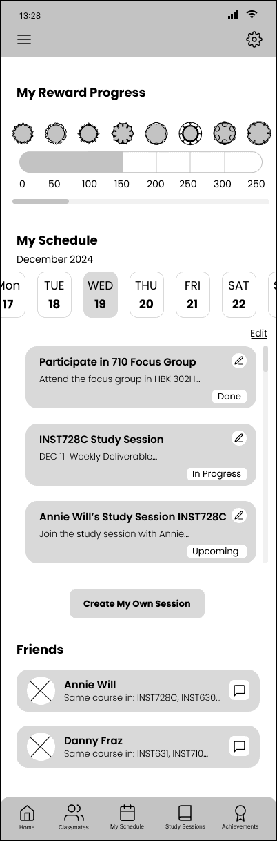 We also identified specific user flows, such as finding a study session and joining, creating a study session and joining, and reflecting on productivity at the end of a study session. We created a few low-fi wireframes based on the user flows to visualize what the app design might look like.