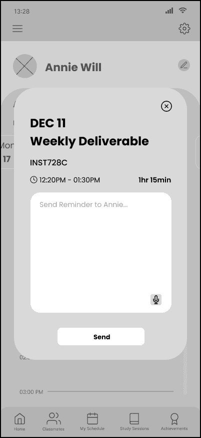 In future iterations, I am interested in getting more insights from students with ADHD through further testing, and seeing which features of the app are being used, and which ones are redundant or unnecessary. I would also like to experiment with the reflection aspect of the app. It would be helpful to have users be more mindful in how they use their time to reflect upon their productivity and how many tasks they were able to complete from their checklist. However, this could be an additional hurdle for students in a hurry to fill out, or may inflict feelings of guilt in the user in a way which is harmful or unproductive.