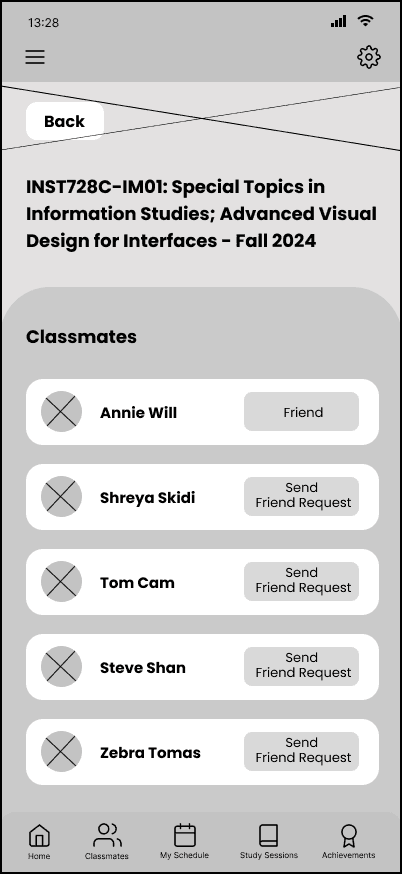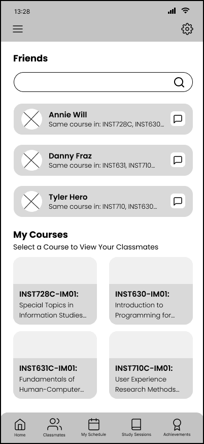 From the co-designing session, we made changes to the organization of pages such as “Friends” and “My Courses” sections, as well as adding subtitles to section headings to give more context to the user.